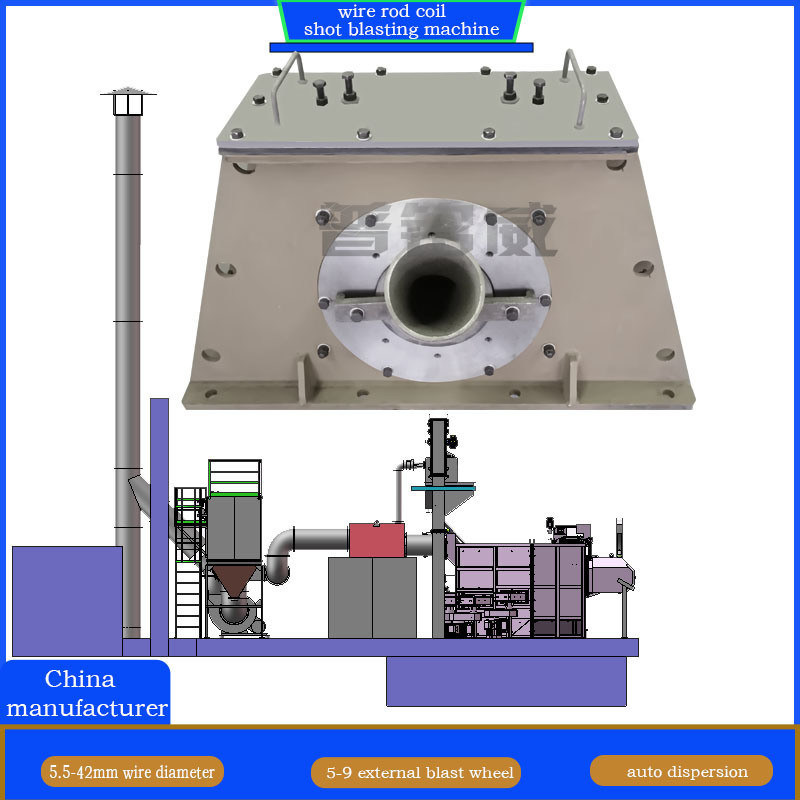 De apparatuur is uitgerust met 6 sets wielerkoppen volgens de kenmerken van de draadstaaf,met een vermogen van meer dan 50 W,Door gebruik te maken van een schroef horizontaal transport schot systeem, hoge sterkte gordel lift, staal schot residu scheiding systeem,tweefasig zuiverings-afstofsysteem (inertie + filter) en (automatisch + handmatig) HMI-elektrisch besturingssysteemHet maakt het werkstuk voldoet efficiënt schot ontploffing vereisten.